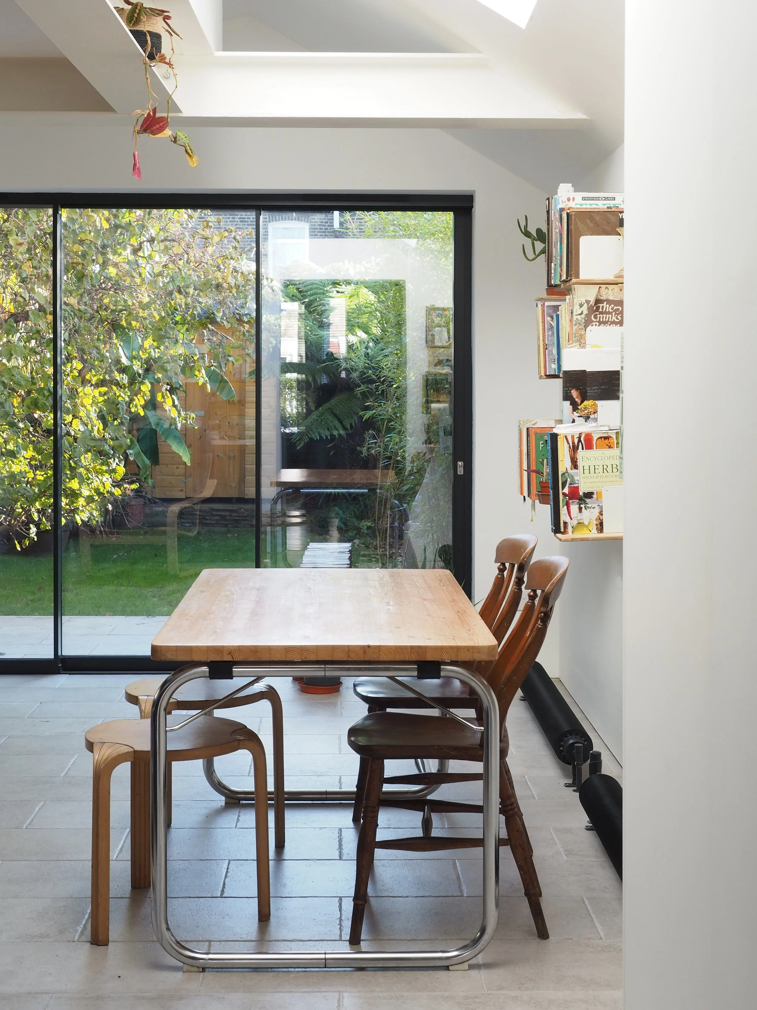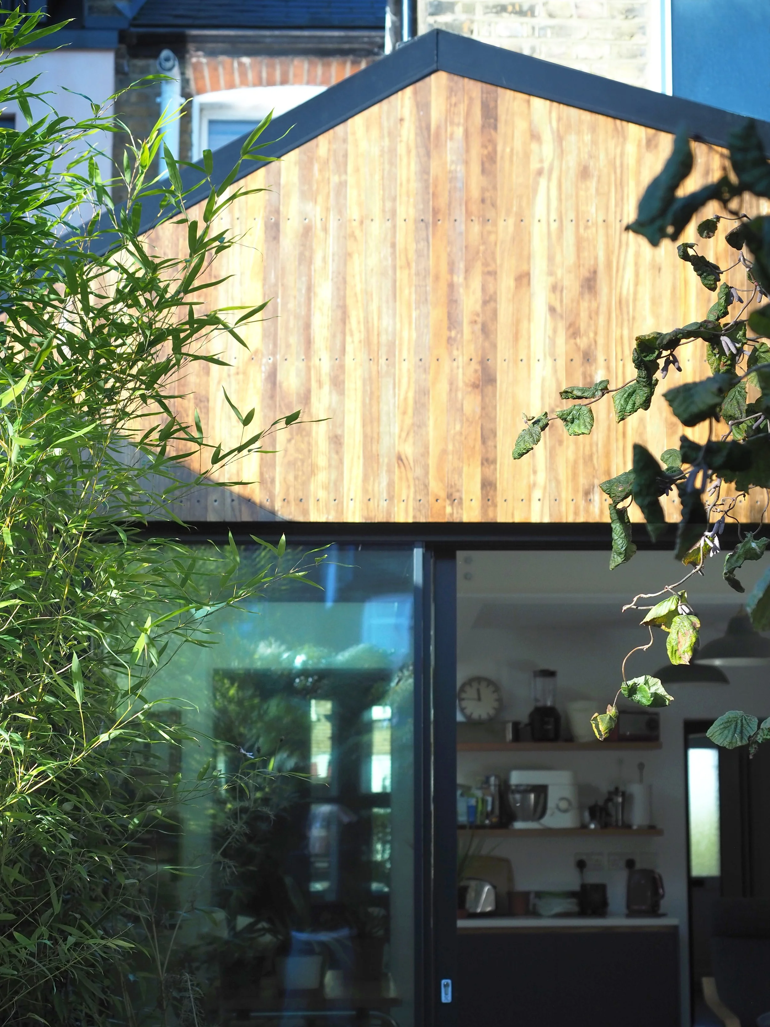 The extensions were built together by the same contractor which allowed both to gain floorspace, share materials and workforce, and create efficiencies on site to reduce waste. The paired forms create a rhythm across the rear of the connected terrace.