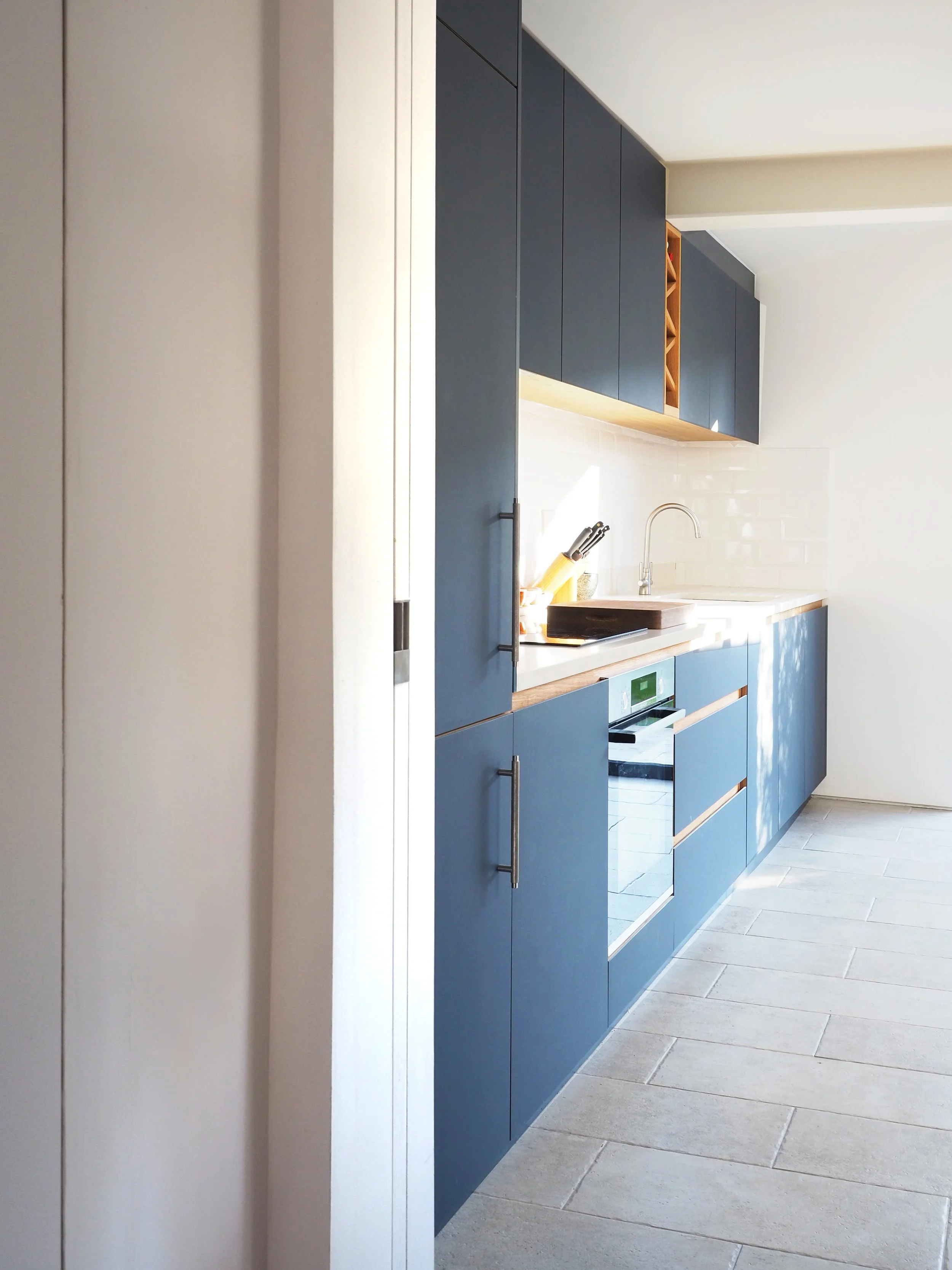 The new kitchen/dining area includes a bespoke-made plywood kitchen with dark blue desktop linoleum fronts and oak detailing, while the dining area features a bespoke designed and made shelving unit created by the client, to define the dining space and inject their character to the new addition. Outside, the warm timber cladding sits quietly within the existing mature garden.