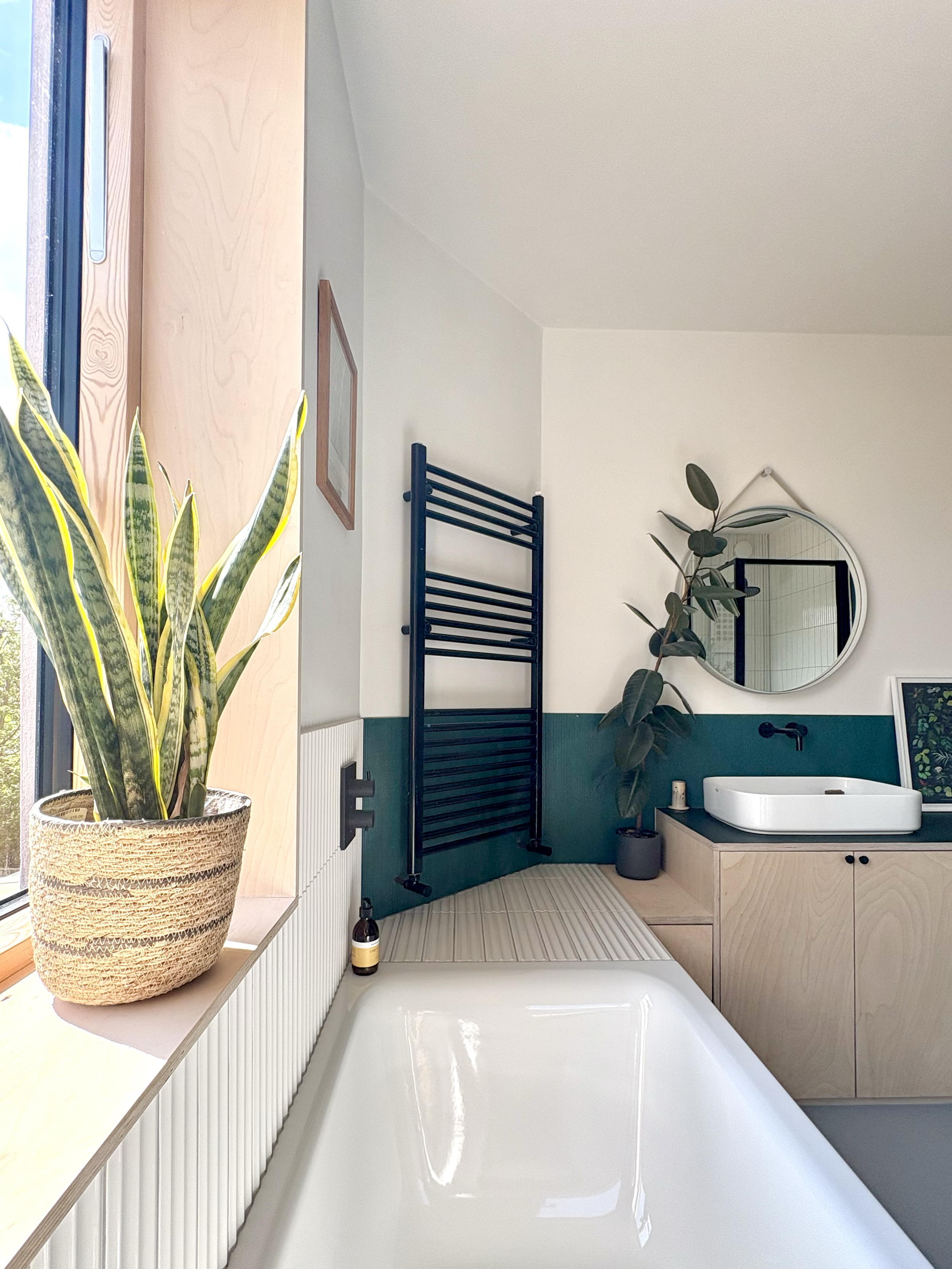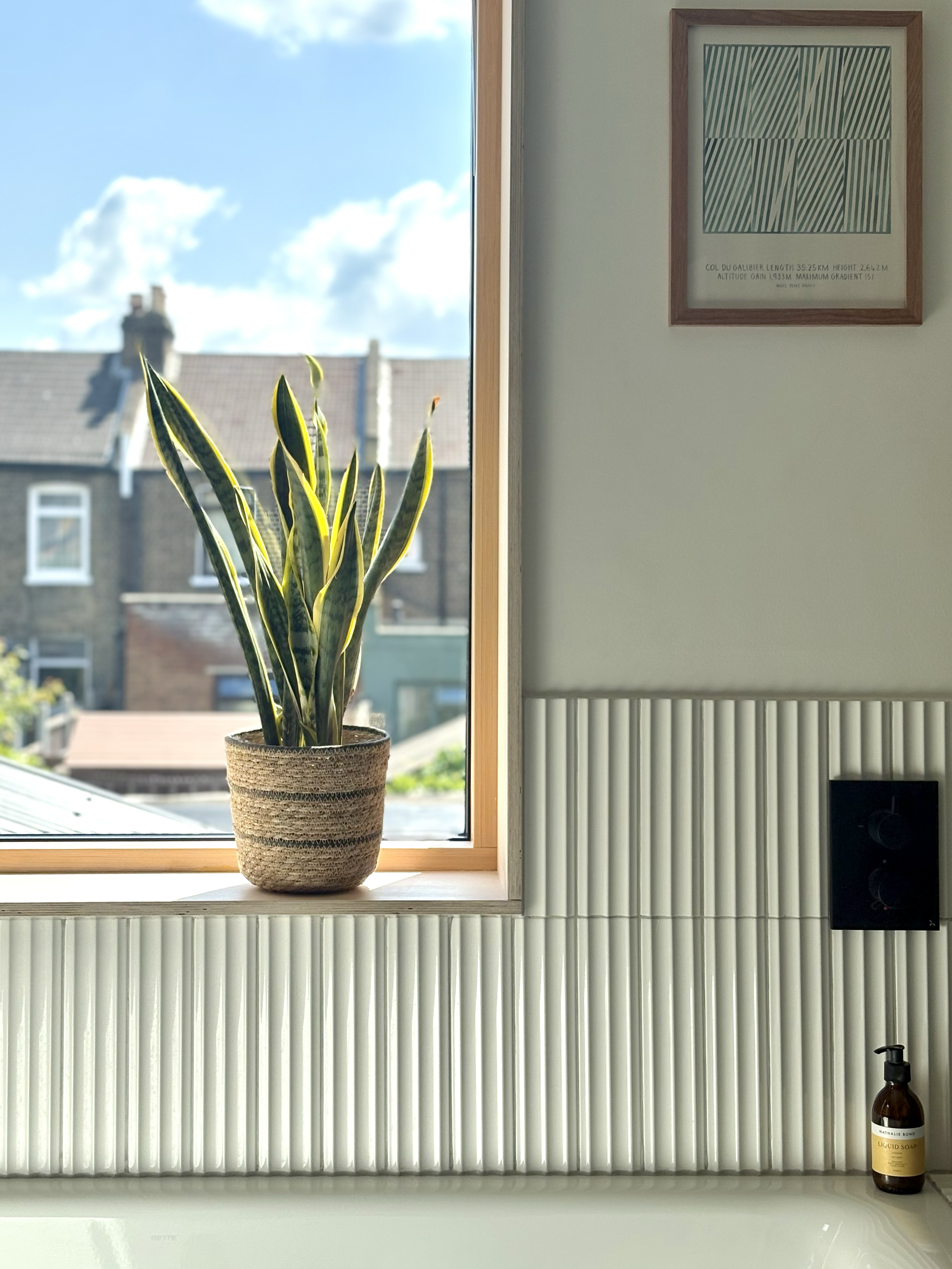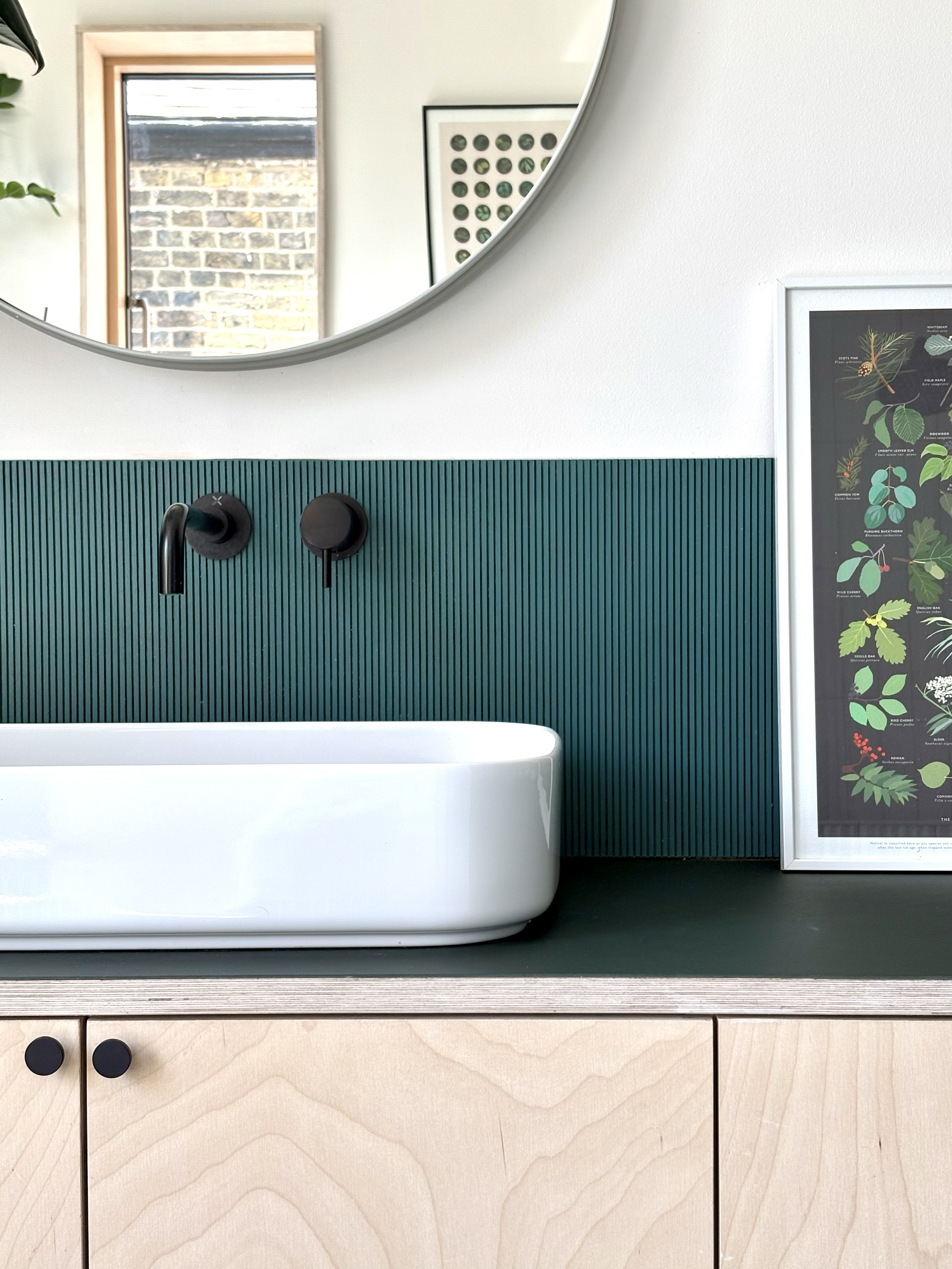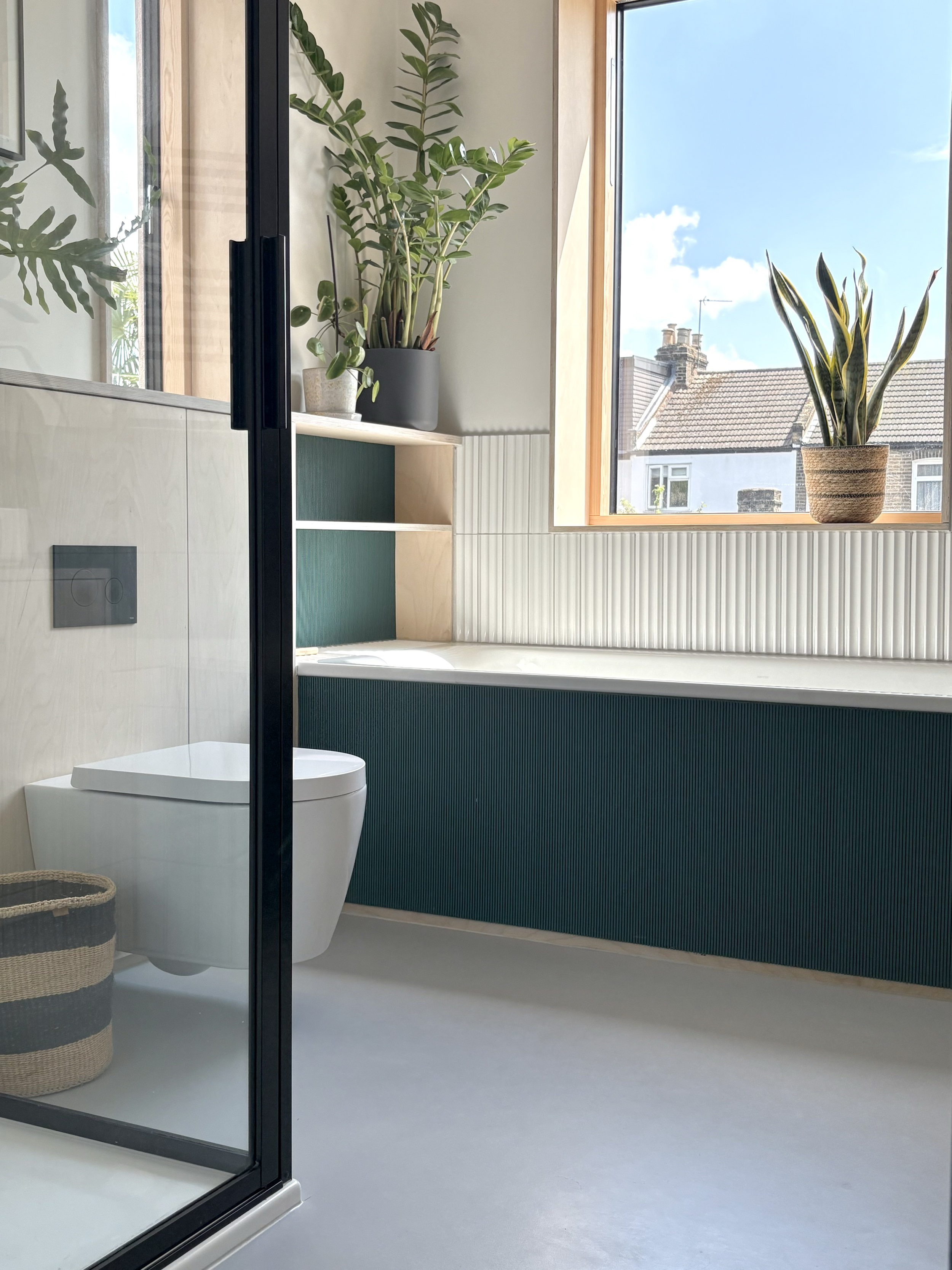 The bathroom features bespoke fitted birch plywood joinery, ribbed panelling and fluted tiles, giving a range of textures and tones. The colour palette is restrained and windows lined with plywood reveals bringing warm light into the space.