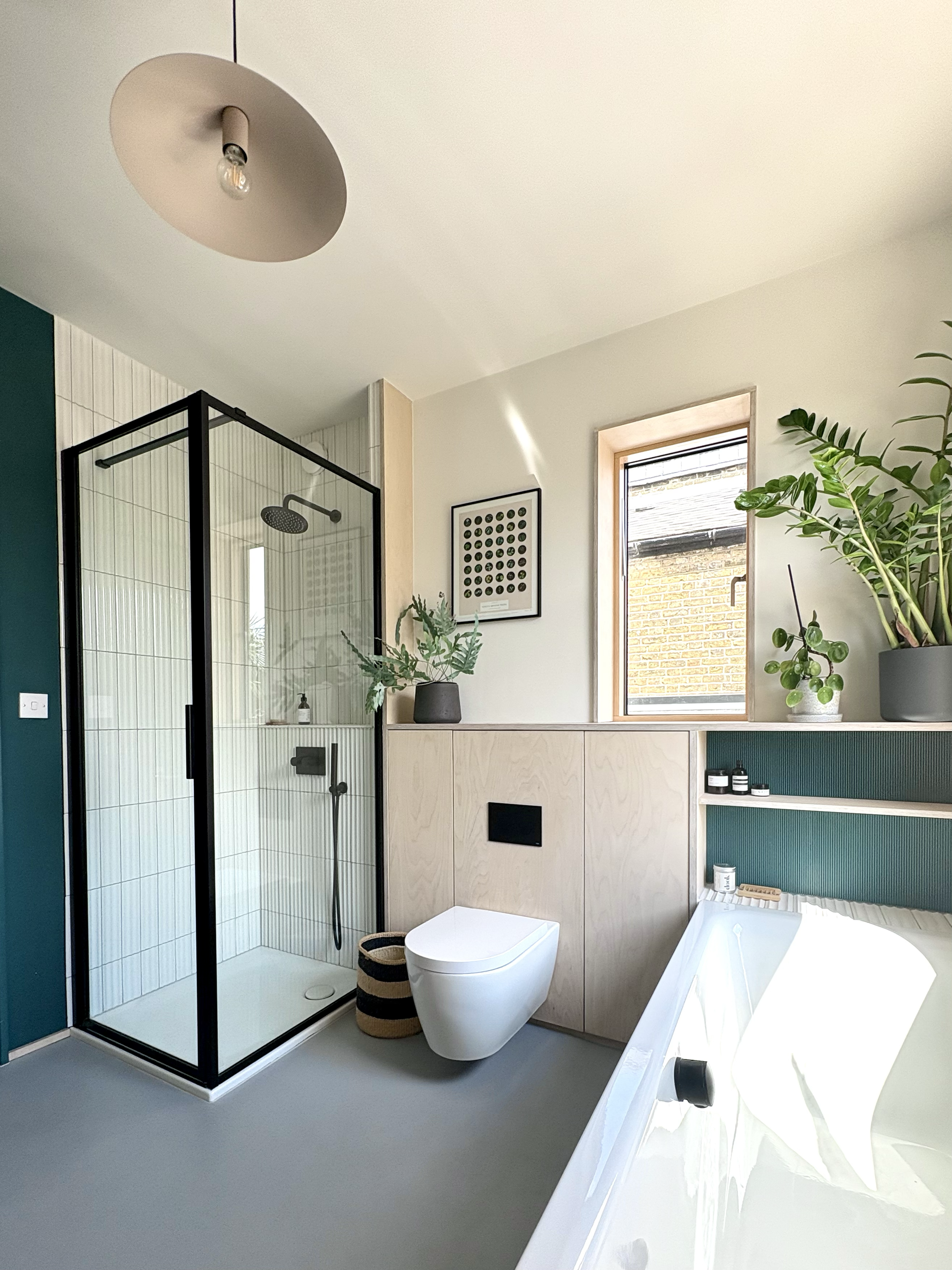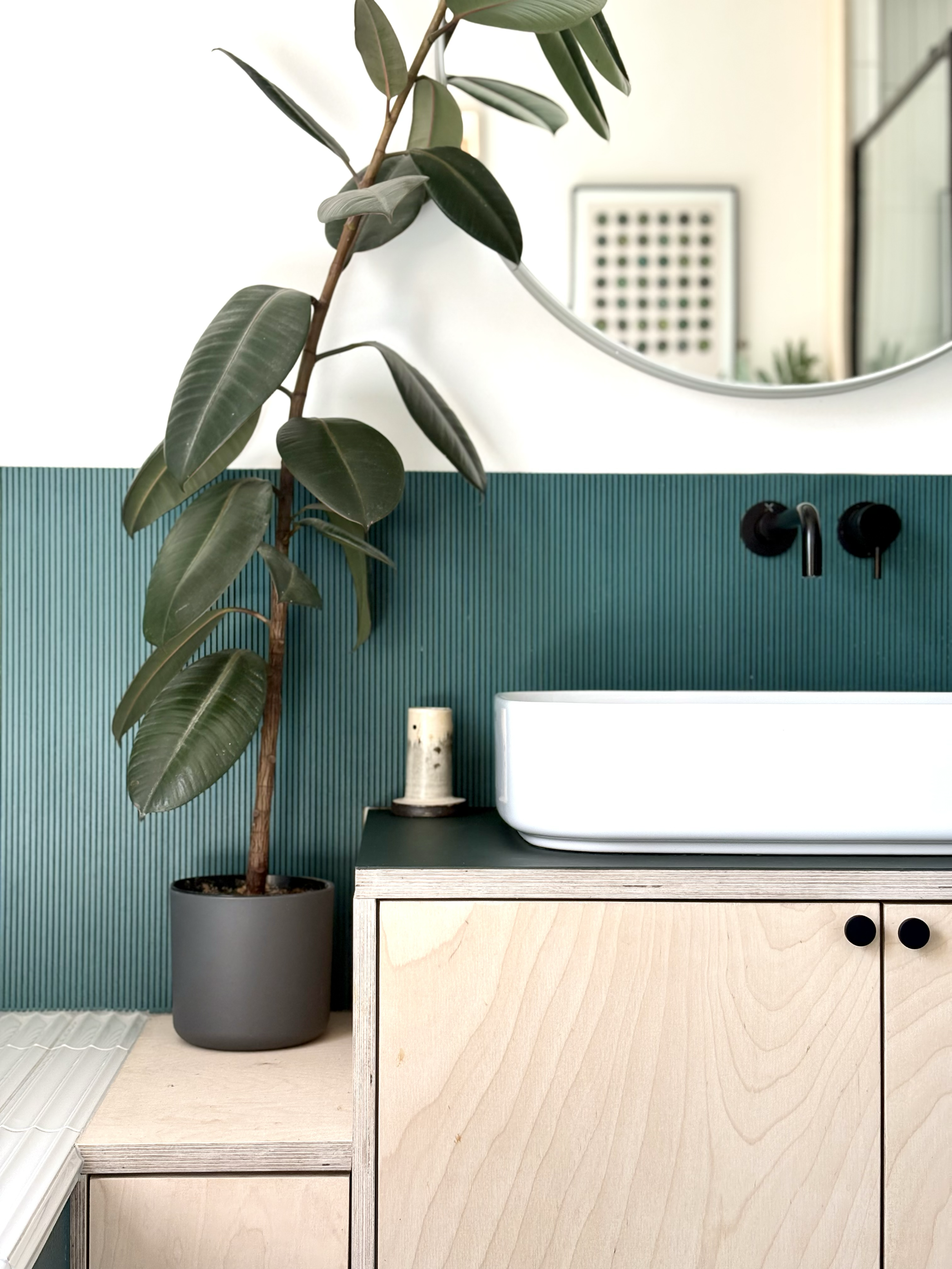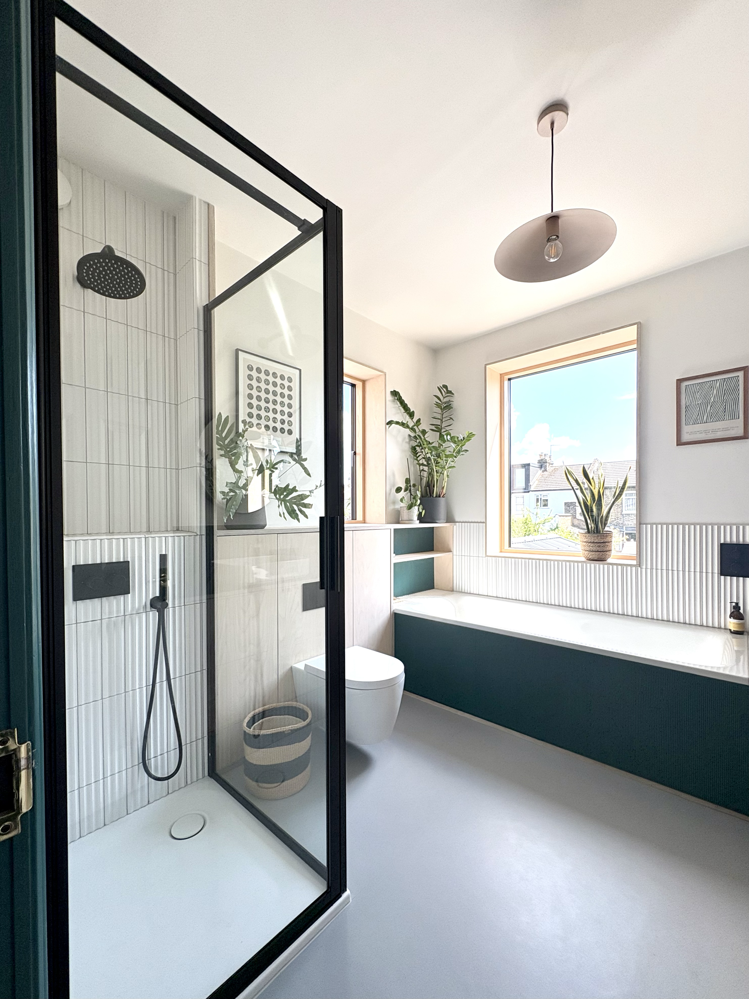 The bathroom features bespoke fitted birch plywood joinery, ribbed panelling and fluted tiles, giving a range of textures and tones. The colour palette is restrained and windows lined with plywood reveals bringing warm light into the space.