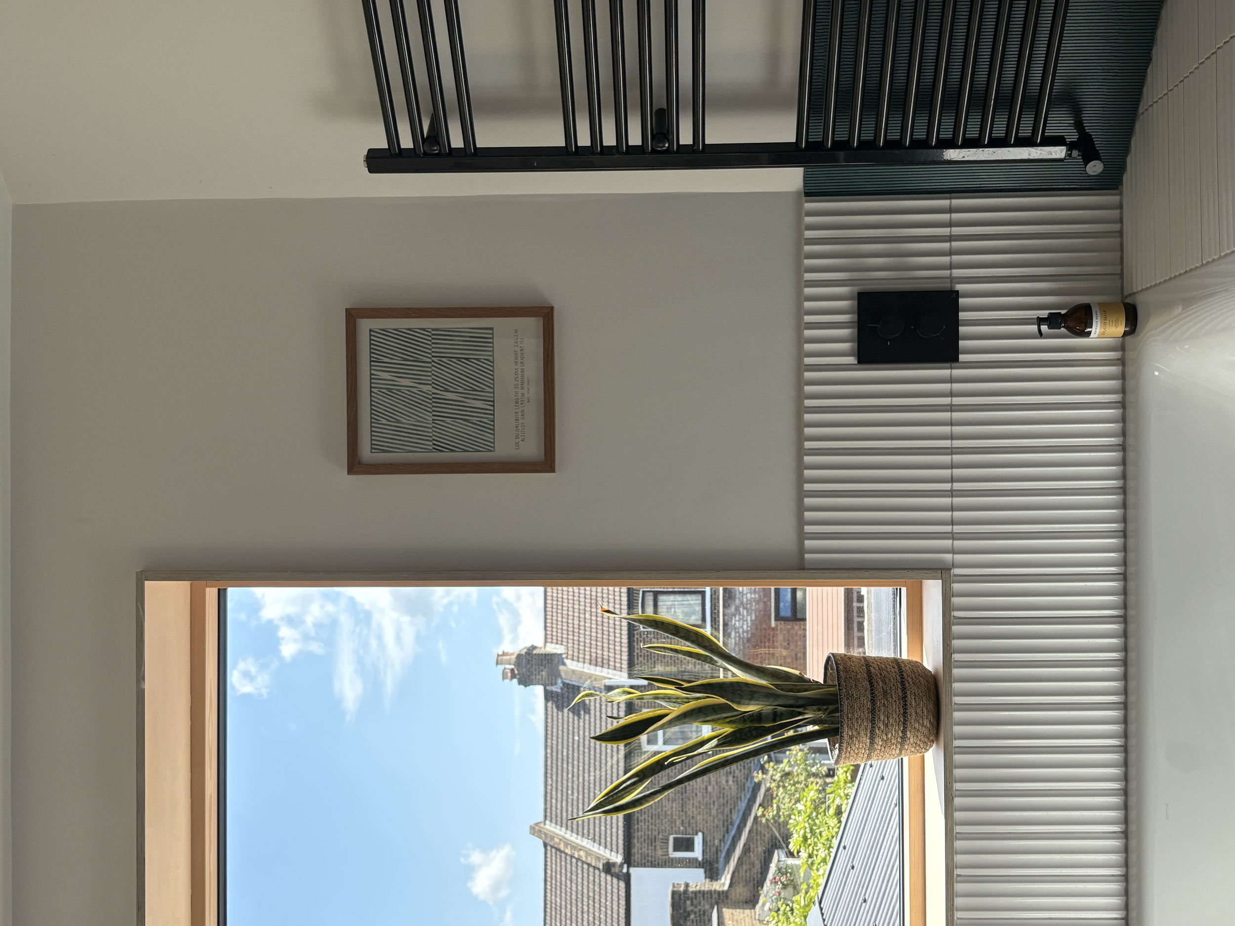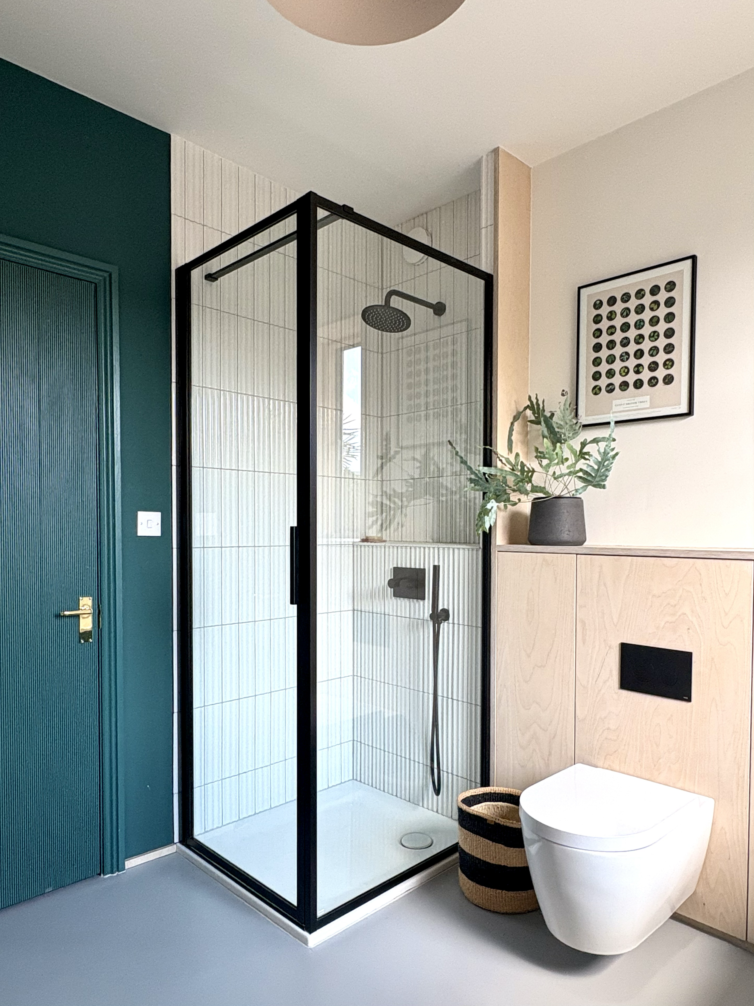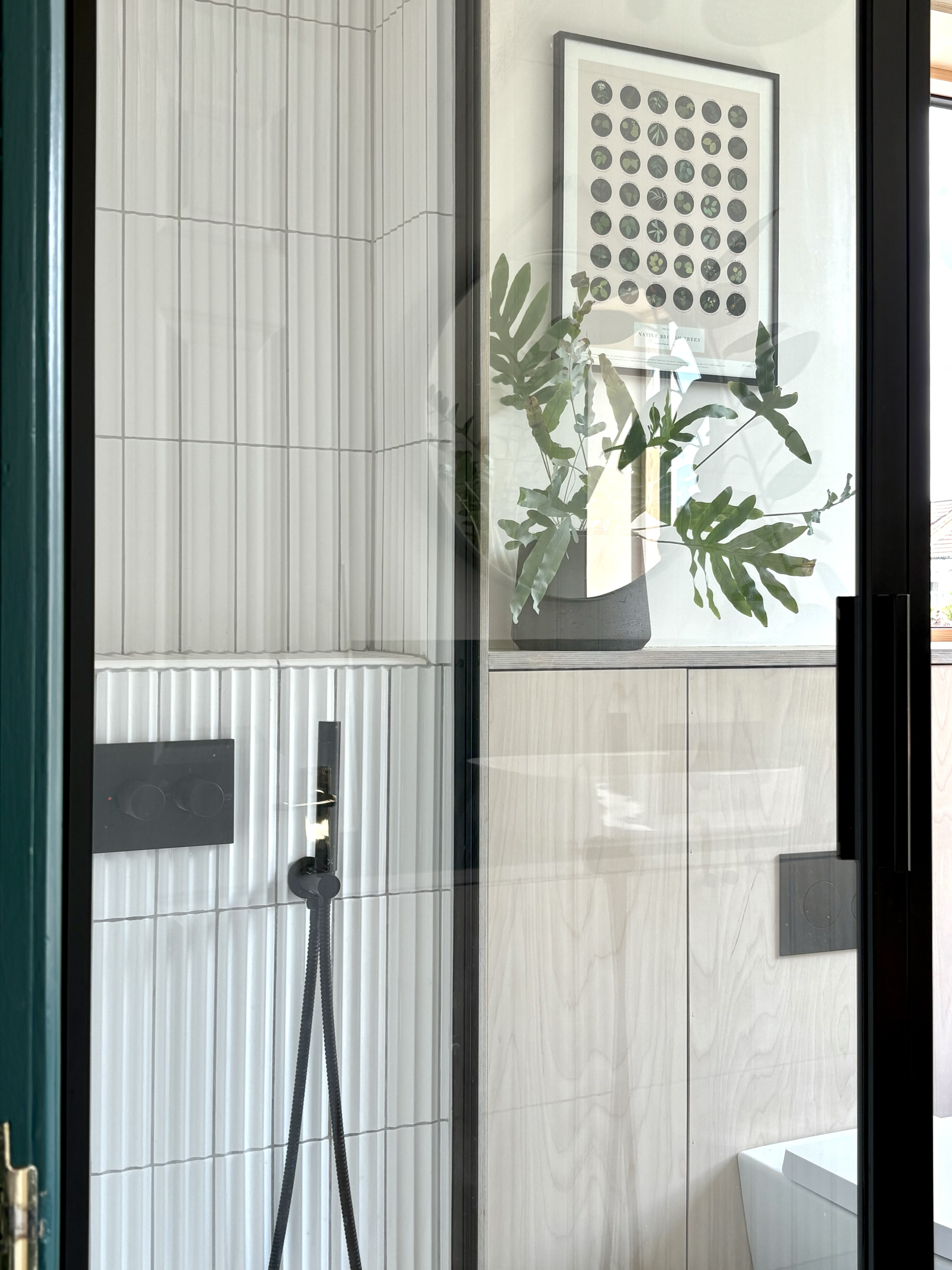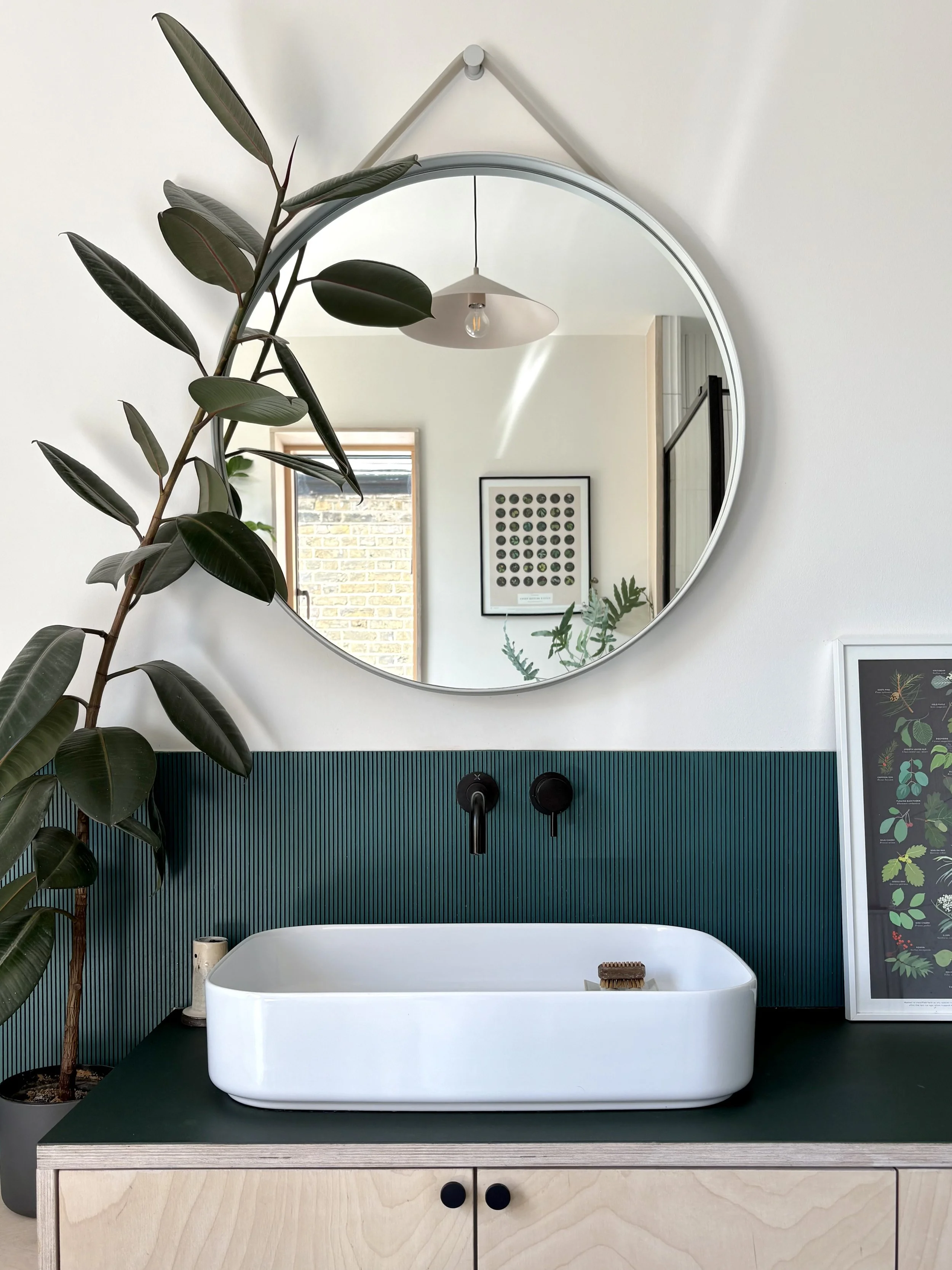 The bathroom features bespoke fitted birch plywood joinery, ribbed panelling and fluted tiles, giving a range of textures and tones. The colour palette is restrained and windows lined with plywood reveals bringing warm light into the space.