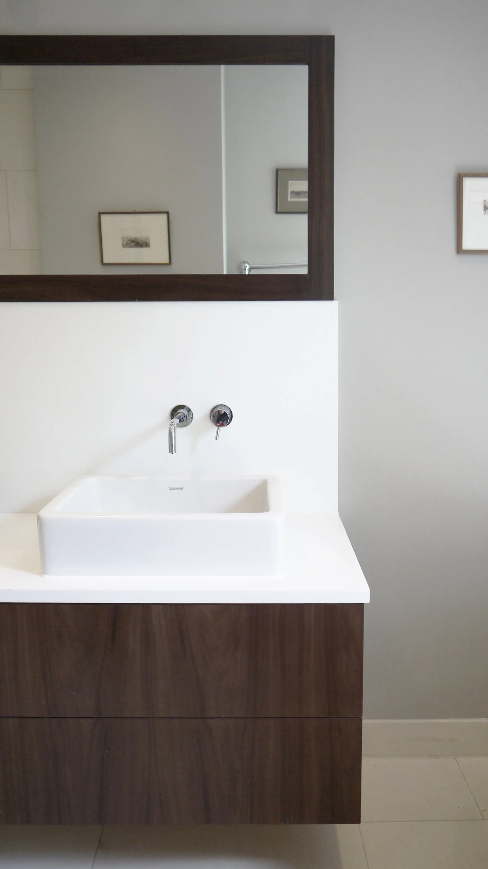 The materials palette is restrained, using calming neutrals complemented with warm walnut, and features a solid surface countertop, splashback and freestanding bath, giving a contemporary feel.