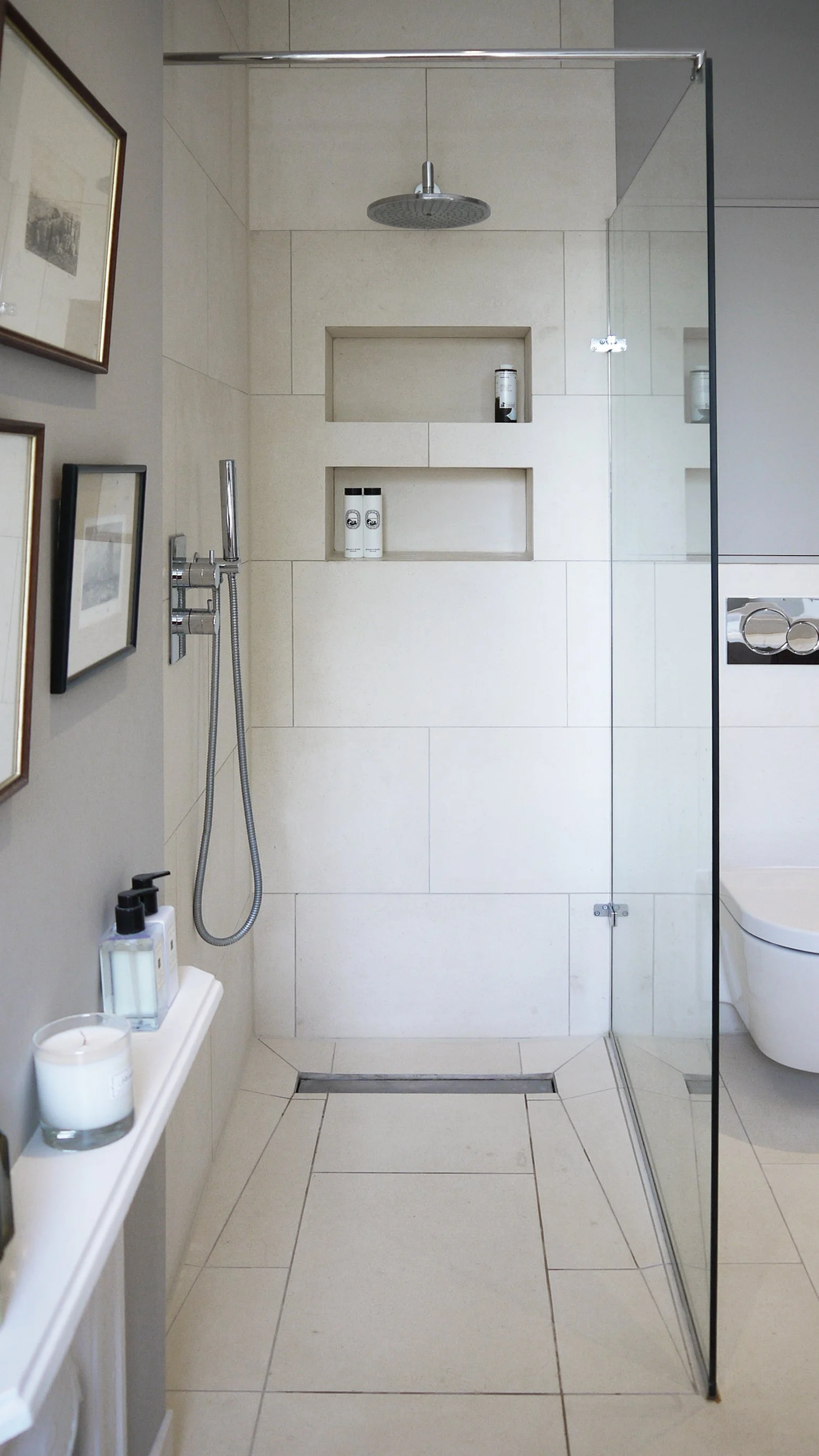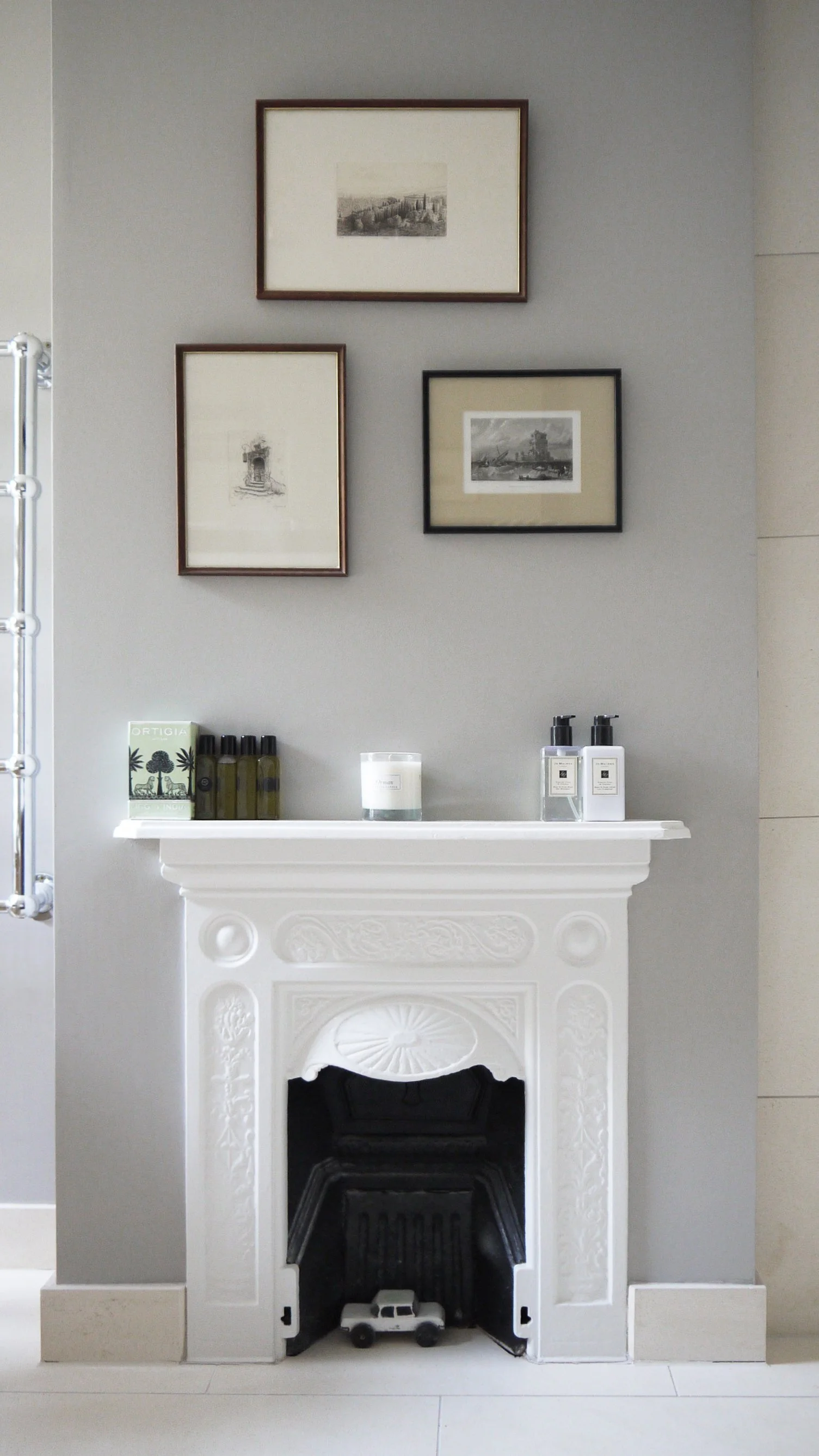 The bathroom space includes an eclectic mix of framed black and white photos, sketches and prints to align with the rest of the Victorian house, where artwork and books feature heavily.