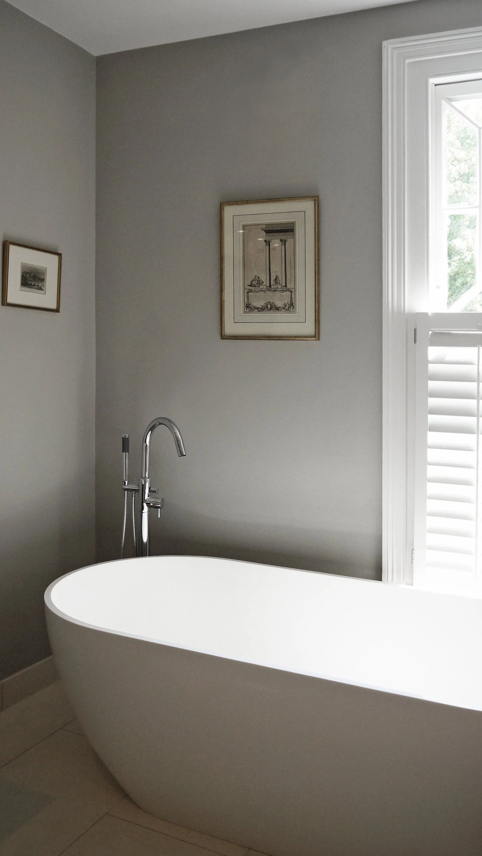 Named after the client’s collection of P.G Wodehouse books, Wodehouse bathroom is calming, contemporary master bathroom that retains and celebrates original Victorian features, which was key to the client’s brief at their home in Queen’s Park. The small space feels light and airy, yet includes a generous freestanding bath and walk-in shower, with the original fireplace forming a central feature.